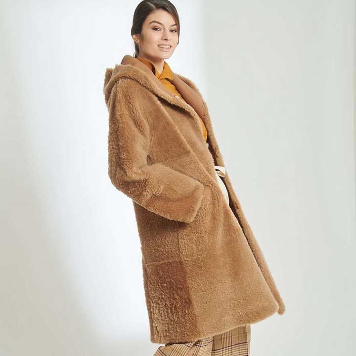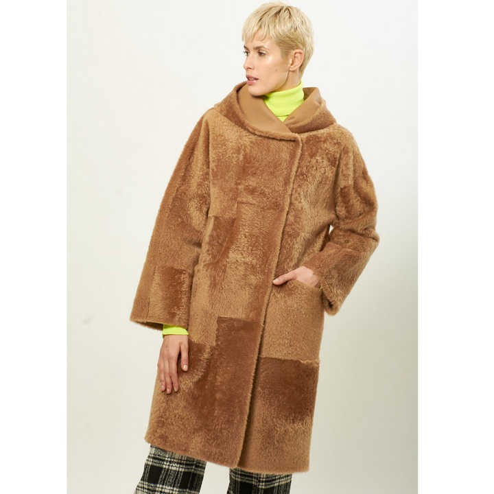 Reversible and loose fit camel-coloured shearling coat, light, warm and elegant, this stunning shearling coat flaunts a loose fit to offer unparalleled comfort at any time of the day, without sacrificing your femininity. Made in very light and soft wool and nappa leather. Available in different colors and materials on request.